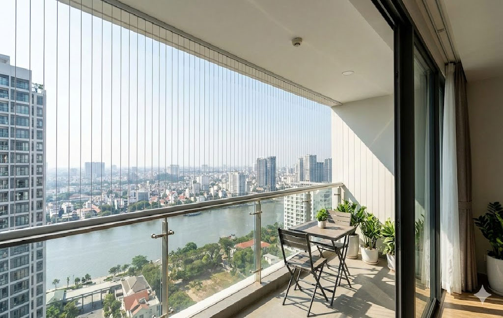 Invisible balcony grills require minimal maintenance. The smooth nylon coating reduces dust accumulation and makes cleaning easy and hassle-free. They can be customized in vertical or horizontal patterns and tailored to fit different balcony sizes and layouts. For enhanced protection, optional anti-theft features can also be integrated into the system.